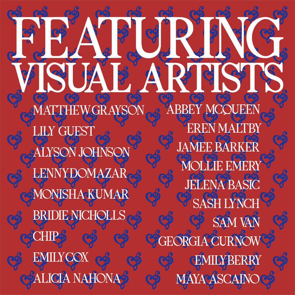Matthew Grayson @thebrokeartistandco, Alyson Johnson @aelis_van, Jelena Basic @jelenabasart, Lily Guest @lilyguesttt, Monisha Kumar @moni_.sha, Jamee Barker @jameelea_, Abbey McQueen @abbeykmcqueen, Sam Van @samvantreasures, CHIP @chippoxia, Bridie Nicholls @bridienicholls, Emily Cox @_emilys_artworks_, Georgia Curnow @georgia.curnow, Alicia Nahona @womeninpariss, Mollie Emery @mollie__willow, Sash Lynch @sashartz_, Emily Berry @skewwie, Maya Ascaino @mayaascaino_art, Lenny Domazar @scratching_ss and Eren Maltby @erens.canvas